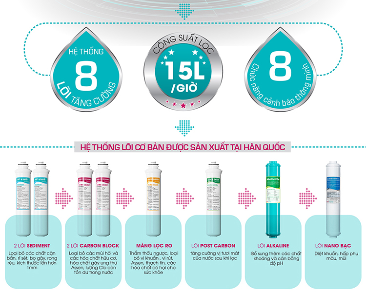 • Cảnh báo thay lõi: qua thời gian sử dụng những lõi lọc sẽ cần phải được thay mới, Tính năng cảnh báo thay lõi này sẽ giúp bạn biết được khi nào lõi phải cần thay mới.