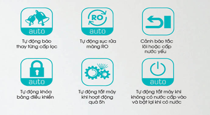 • Tự động sục rửa màng RO: màng RO giúp loại bỏ những vi khuẩn cũng như các ion kim loại nặng, sau thời gian sử dụng hệ thống sẽ tự động sục rửa màng RO để màng lọc được hoạt động tốt hơn.